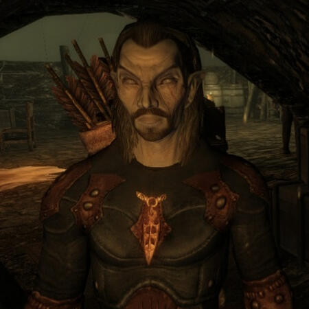 Gender: MaleMukava is a dark elf who was arrested and brought to Helgen for illegally crossing the border. He, Fylix and Mogak all witnessed the Helgen-disaster unfold and managed to escape successfully. However, Mukava was not left unharmed - the lower side of his face was left with burns.At a young age, Mukava was taught a great range of fire magic by his father. However, the events of Helgen and Morrowind's Red Mountain erruption have led to him seeing said ability as a curse. Whilst he still uses fire magic in close swordfight encounters, he prefers to use his bow.Mukava initially wondered the roads, searching for somewhere to stay for the near future. He met with a strangely dressed imperial and managed to help him convince a farmer to fix his cart. Whilst the man was annoying, he gave Mukava enough gold to make his way over to Windhelm.There, he met a young boy and enacted his revenge plan against the woman who ran the orphanage in Riften - which led to Mukava joining the Dark Brotherhood. Skilled at both stealth and archery, he was quickly seen as a valuable asset for the 'family'. Eventually he was chosen by The Night Mother to be the new Listener.He became friends with a Nord who he met in a tavern and began travelling with him. Unfortunately, his friend was killed within the ancient burial site in which they were meant to meet a person supplying a contract. Mukava took his helmet and weapon, and laid them outside as a makeshift grave. As part of his grieving process, he began spending more time at the sanctuary, and talking to the Keeper.The plot of the Dark Brotherhood's questline continued as normal, and got to the point in which Astrid demands Cicero (the annoying jester from earlier, AKA the Keeper) be killed. Seeing Cicero in his weakened state on the floor, with the added background of their friendship, Mukava couldn't bring himself to kill the imperial. Instead, he left some supplies for Cicero to use in his recovery - health potions, food, etc.At the last stage of the quest, Mukava discovered Astrid's betrayal, and upon seeing the Falkreath Sanctuary in flames, had flashbacks to both Morrowind and Helgen. Once again, he began to blame himself and his own magical abilities, instead of the woman who sold them out.Having ended the questline, Mukava now travels Skyrim with Cicero, fulfilling the brotherhood's contracts one-by-one. Occasionally, he experiences night terrors in which he relieves the smell of burning flesh and screams.Mukava likes to use alchemy as a stress-reliever. He also enjoys cooking, but he cannot cook whatsoever. Instead, he's taken to hoarding the food he's found on his travels.