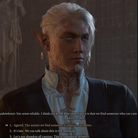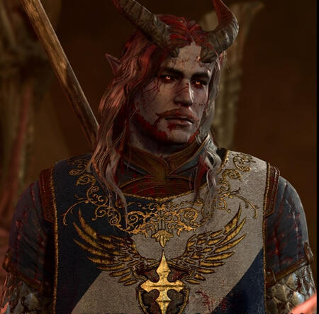 Mantra is my semi-evil-turned redemption Dark Urge in Baldur's Gate 3.He is a paladin of devotion, and despite generally sticking to the oath in Act 1, he did not care about others and their issues. He is impulsive (thanks -1 intelligence!), and the only person he cares for truly is himself. For example, he rescued the man trapped in the blaze, but took the ring as payment.He elected to ignore the grove/goblin dispute entirely, meaning the refugees all died in his save.His turning point was in Act 2, after realising his urges would turn on his friends. In addition, he lost his oath in this act to rescuing Wulbren Bongle.In Act 3, he rejected his Father, electing for death as a safer measure than his life. After being resurrected without the dark urges, he developed somewhat of a saviour complex - not truly believing he can be redeemed, but not wanting others to suffer similar fates he once caused. However, empathy is still something he struggles with, though with the urges gone it is easier to understand.Mantra is an Astarion romance save. Whilst the fourth slot switches out, him and Gale are mainstays. The wizard is pretty much his best friend (although Tara did in fact try to kill him upon meeting her for the first time).A minor detail, Mantra is transmasc. It doesn't impact his story much, if at all.