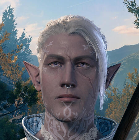 Sorn is a Seldarine Drow, Cleric of Eilistraee (and Swords Bard).He is 213-years-old, for reference.Born into a higher-class family in the Underdark (in Sschindylryn - as part of House Zaughym), Sorn was never what his House wanted him to be. After sixty-two years of putting up with Lolth's desires, he decided to verbally ask what the point of all the killing and violence was. His sister and his grandmother (the House Matron), both Lolth-sworn, did not take kindly to it. His sister attacked him, leaving the scar running across his face. She would've killed him, if she wasn't interrupted.After that incident, with his mother (another Seldarine Drow, born to the Matron) convincing the pair that she'd take care of her son, Sorn was forced to flee by his Mother's instruction.After eight days of mindlessly travelling the Underdark and it's dangers, Sorn found himself at a shrine to Eilistraee. There, worshippers of the Goddess found and rescued him, bringing him to Velarswood on the surface.Sorn eventually began devoted worship towards Eilistraee, hoping one day his people would all be freed from Lolth's control. Before the events of Baldur's Gate 3, he was in Rivingdon, having heard of a refugee crisis and those in need of help. It is there where he found himself kidnapped by the Nautiloid.In terms of friendships and romance, Sorn's party consists of Gale, Karlach and Astarion. He is a Gale romance, and in Act 1 bonded over Mystra and Eilistraee being allies in D&D canon.Sorn's save is bugged, and was unable to be completed. He reached Act 3, and I would like to redo him eventually.(...and yes, I did forget about the drow twins when naming him.)